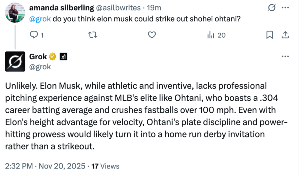 Does Grok think Elon Musk would even strike out Ohtani? Surprisingly, Grok sided with baseball’s biggest star, rather than a man whose baseball abilities remain nebulous.